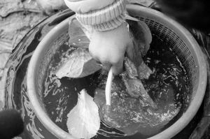 天这么冷,谢丽丽还在用凉水洗菜,小手被冻得红红的。