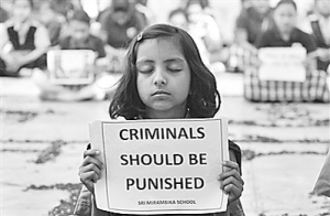 12月29日,印度艾哈迈德巴德市,一名小女生参加被轮奸女大学生不治身亡的悼念仪式。她手中的打印纸上写道:应该惩罚罪犯。