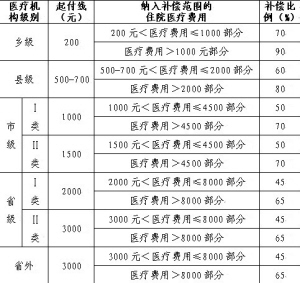 新政1: 科学设置起付线和补偿比。对患者住院医疗费用实行分级分段补偿。(如图表分级分段补偿标准)