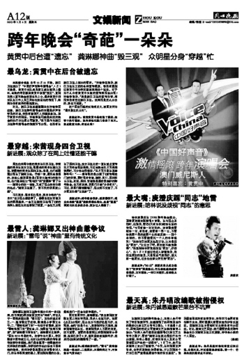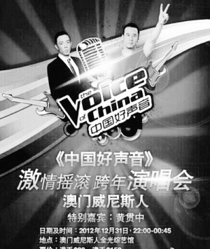 本报综合消息 去年12月31日晚,浙江卫视播出了“中国好声音跨年演唱会”,1月1日凌晨,黄贯中乐队成员麦文威在微博上爆料,当晚的特别嘉宾黄贯中惨遭“遗忘”,直到主持人宣布晚会结束也未上台,最后黄贯中和乐队在工作人员已开始收拾场地的情况下,坚持为没有离开的歌迷演出。