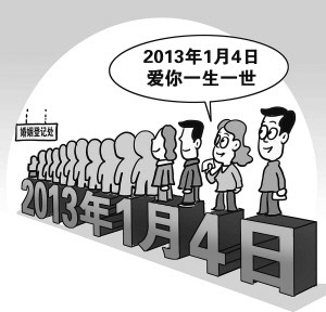 2013年的1月4日,貌似平常的一个日子,因为其谐音为“爱你一生一世”而被称为“万年真爱日”。据估计,仅北京市当天登记结婚的人数有望突破1万对。这个场景我们并不陌生,几乎每个“吉日”比如情人节、神棍节等,隔段时间便会重演一次。据报道,1万对这个数字超过了2012年12月12日的“世界示爱日”7700对,仅次于2009年9月9日“天长地久日”的1.9万对和2008年8月8日的1.5万对,远远超过了每年“情人节”三四千对的数量。
