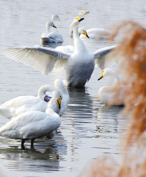新年伊始,河南三门峡黄河湿地的白天鹅数量达到近万只,吸引了全国各地的游客和摄影爱好者前来这里观赏、创作。近年来,由于栖息环境的改善,三门峡黄河湿地已由白天鹅的越冬停歇地变为越冬地。每到冬季,大批的白天鹅从遥远的西伯利亚飞临三门峡水库和附近的水域,觅食定居,休养生息,数量由上个世纪90年代的几十只增加到现在的上万只,成为名副其实的“天鹅湖”。新华社记者 王颂 摄