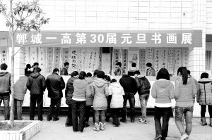 为活跃校园文化生活,弘扬祖国传统文化,近日,郸城一高举行了元旦书画展,共展出各类优秀书画作品300余件,受到了师生的欢迎和好评。图为同学们正在欣赏参展书画作品。(王雪涛 摄)