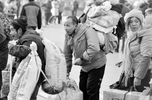 1月8日,在太原火车站,外来务工人员背着行李进站乘车。