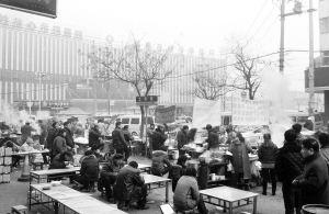 1月10上午,记者在周口市区人民路与工农路交叉口看到,曾经消失过一段时间的小吃摊点,再次重出“江湖”,继续占道经营,继续堵塞交通,继续影响市容。