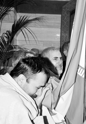 当地时间1月9日,在叙利亚首都大马士革,获释的伊朗人质亲吻国旗。