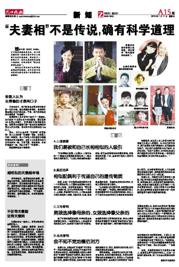 美国研究人员日前专门进行了一项测试:他们找来22名男女各半的志愿者,通过观看160名男女的照片,来猜测其中谁和谁是夫妻。结果男女志愿者们都一致地把长相相似的男女认定为夫妻,而且猜中的比例都高达70%以上。
