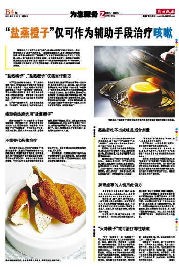 “盐蒸橙子”仅可作为辅助手段治疗咳嗽