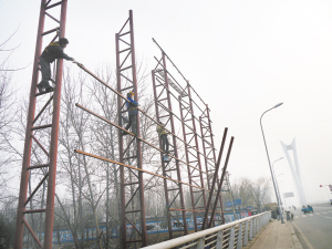 昨天下午,记者来到大庆路桥北看到,在大桥东侧已经竖起高十余米,宽40米左右的钢架结构广告牌的雏形,有4名工人正在现场施工(如图)。记者询问工人施工单位是谁,工人表示并不知情,随后告诉记者他们的老板姓李,此时正站在岸边。李老板告诉记者,他们是受雇于人修建广告牌,听说广告牌建好后,先是用于公益宣传,几年之后,会转为商业用途。当记者向他询问施工有没有通过相关部门的审批,李老板表示他也不知情。