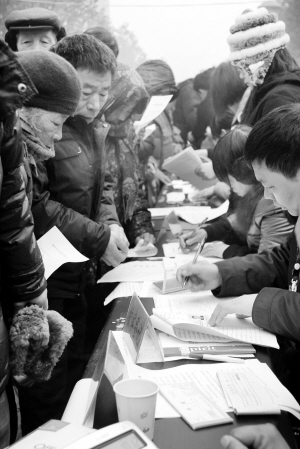 整个上午,工作人员核实登记、计费收费、合同签订、验房交房,忙个不停,交房现场气氛热烈,虽然在场的工作人员和市民冻得直哆嗦,但他们都显得异常激动。