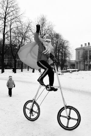 1月13日,在俄罗斯圣彼得堡,市民扮成“严寒老人”,参加骑自行车巡游活动。