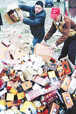 1月10日,工作人员正在集中销毁一批假冒伪劣白酒。当日,为了严厉打击销售假冒伪劣商品和制止侵权行为,全国工商系统“双打”先进集体——福州市仓山区工商局集中销毁了一批假冒伪劣商品。主要有无法提供检验报告的“赖茅酒”、假冒伪劣“五粮液”等多种白酒和进口葡萄酒。该局近年在开展“打击侵犯知识产权和制售假冒伪劣商品专项行动”及“八闽红盾出击”等系列执法专项行动中,共立案查处各类经济违法案件1215件,案值3323余万元,移送公安机关大要案15件。
