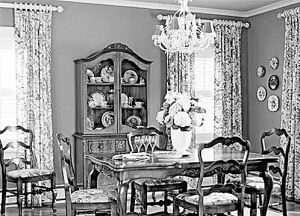 尽管餐厅的布置依然以蓝白两色为基调,但在这个空间里蓝色的使用比例略多于白色。大面积钴蓝色的墙面对视觉效果起到了决定性的作用,搭配白底蓝花的窗帘、蓝色调饰面的座椅和灰蓝色格子纹样地毯后,与客室形成微妙的色彩变化,这种深浅的差异让两个空间虽同为蓝白色调装饰,却有着不同的效果,令空间表现更为丰富。