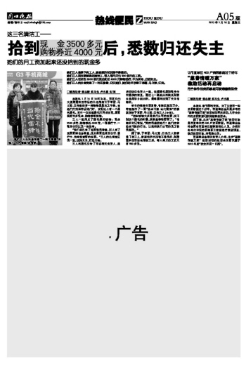 拾到现金3500多元购物券近4000元后,悉数归还失主
