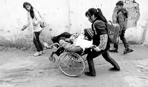 “女大十八变”,升入七年级的大女儿王丹,已经20岁,她与15岁妹妹王小菊是同桌,因病理反应加上缺少运动,两人均出落得“膀大腰圆”。她们和读四年级的弟弟王彬,因个子远远超过同班同学,故都坐在了教室最后一排。“叮铃铃——”第三节下课铃响,但见杨妈妈抢进校门,飞奔般跑入701班教室,抱起比自己更高大的王丹,让她扶桌站定,然后自己背对孩子,双腿跪地,100多斤重的孩子,重重地压在了她背上,因女儿全身不听使唤,1.51米高的杨妈妈,只能一步一颤地朝厕所移去。接着再背两个弟妹,等到他们全部上完厕所,已是上气不接下气。