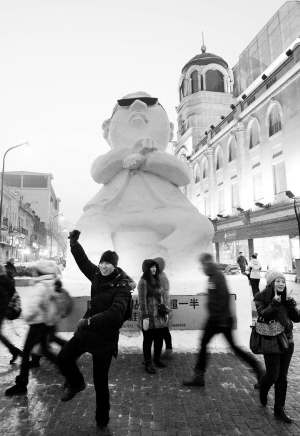 1月19日,游客在哈尔滨中央大街上“鸟叔”雪雕前跳“马舞”。