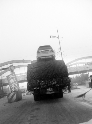 昨天,在周口大道上,一辆拉满货物的货车上竟然还载着一辆轿车,一路晃晃悠悠,十分危险!晚报记者 朱海龙 摄