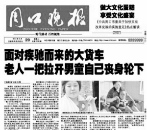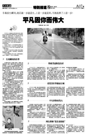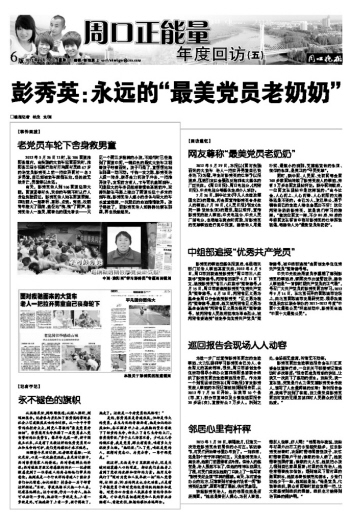 2012年5月29日,本报以《面对疾驰而来的大货车 老人一把拉开男童自己丧身轮下》为题,率先对彭秀英的壮举予以报道后,迅速引发社会强烈反响和各大媒体的广泛关注。《周口日报》、周口电视台,《河南日报》、中央电视台等媒体先后介入采访。