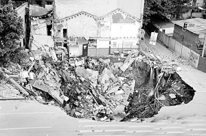 1月28日下午4时许,随着“嘭”的一声,广东省广州市荔湾区康王南路与杉木栏路交叉处,一家拉面馆突然发生塌陷,随后整栋楼慢慢陷下去,两栋楼共6家商铺、路上两棵大榕树“坠入”大坑内。40分钟内共发生6次地陷,而当晚9时许,在浇灌水泥“补洞”时,又发生两次地陷。