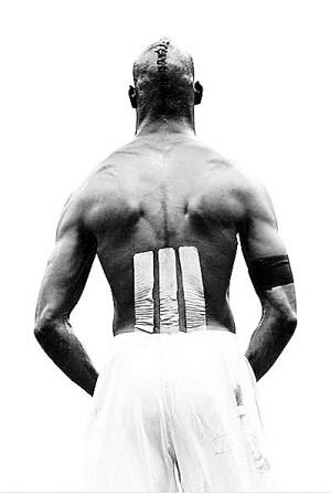 巴神背后的贴布,一侧沿着肌肉的起始部位 (沿脊柱),一侧顺着肌肉走向外侧,脊柱两侧对称贴扎,可以缓解背部肌肉疼痛。