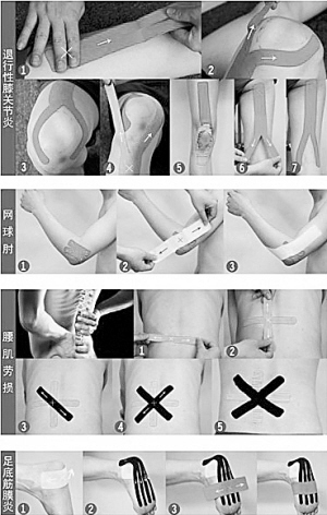 每一道贴布均与其相邻的上一道贴布重叠1/2;要注意维持稳定的张力及顺畅的速度,并随着身体部位的轮廓变化而修正贴扎角度。