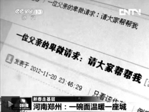 2月1日19时央视《新闻联播》在头条新闻《一碗面温暖一座城》里,用4分钟时间讲述了这个爱心故事。
