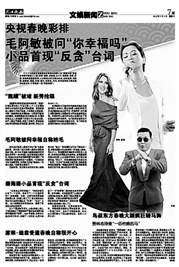 某电视记者深入演播厅后台“逮”各路备战明星,其中接二连三的雷人提问令旁观者忍俊不禁。自1988年起就与春晚结缘的毛阿敏此次带来一曲《幸福》,该记者连称此歌好听,并抛出央视年度招牌问题“你幸福吗?”毛阿敏回答“我挺喜欢这个主题的。”记者仍旧不依不饶要回答,毛阿敏只好说“我姓毛。”记者大笑说:“你真是太搞笑了。”