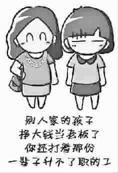 在网友“小仙miko”创作的漫画《别人家的孩子》中,“别人家的孩子都生小孩了,你还在家里当小孩”,“别人家的孩子找着好工作了,你还每天睡到太阳晒屁股都不肯起床”,“别人家的孩子考研究生、博士生了,你就一‘双失’”……在漫画的最后,“别人家的孩子,我真的很讨厌你。”说出了大多数网民的心声。