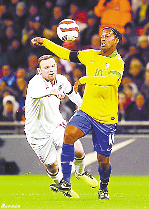 同样是百场先生,小罗运气却不佳。第19分钟他在左路的传中打在威尔谢尔手上赢得点球,但罗纳尔迪尼奥射出的点球却被乔·哈特神勇扑出,罗纳尔迪尼奥补射也被乔·哈特再次救出,内马尔小禁区边缘再射偏出。英格兰第26分钟随即取得领先,威尔谢尔直传,沃尔科特小禁区前推射被塞萨尔扑出,但鲁尼禁区边缘补射空门入网。虽然巴西第48分钟由弗瑞德扳平比分,不过英格兰第60分钟凭借老将兰帕德禁区弧的一记远射制胜。