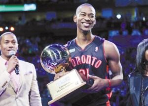 在最精彩、也是最后进行的扣篮大赛中,6位参赛选手分别拿出看家本领。经过两轮比赛,罗斯和埃文斯代表东西部进入到最后的决赛。埃文斯第一个动作跨越一块遮住的油画板后扣篮成功,然后他掀开遮布,展示了一幅自己扣篮的油画。而后穿上前辈卡特战袍的埃文斯,在完成第一个动作中,与队友完成了空中接力。第二轮埃文斯仍旧玩跨越,这次由坐在场地中央的队友将球抛起,他在跨越的同时,空中单手将球扣进。罗斯最后完成的动作是飞跃一个小孩,然后再胯下换手扣篮。通过球迷网上投票,罗斯得到了58%的支持率,获得了扣篮王称号。