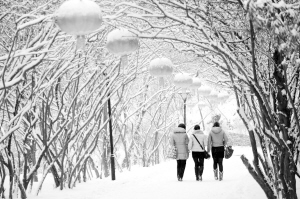 2月18日,市民从甘肃省平凉市柳湖公园高挂的红灯笼下走过。