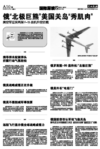 这次事件发生在美国总统奥巴马2月12日发表国情咨文数小时前。《华盛顿自由灯塔报》首先报道了这个消息。该报还报道称,俄罗斯轰炸机装备了配有核弹头的巡航导弹。央视报道说,后经证实这是误解。美国空军称,拦截俄轰炸机的两架美军F-15战机正在参加“对抗北方”年度军事演习。