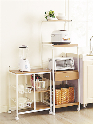 2.各种推车是非常方便的工具。例如客厅里盛放杂志的推车、功能间里放置杂物的推车、厨房里放置碗碟的推车等,这些推车实质就是带上轮子的小收纳空间。在选择时,如果推车平时放在角落里收纳杂物,可以高一些;如果以运送碗碟为主,宽大细长、搁板中间间隔小的就可。