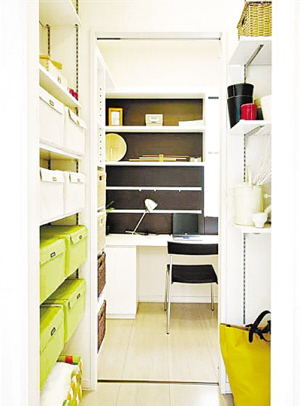客厅是一个容易散乱的空间,如果客厅与饭厅相连,空间较大,可以设置一个“客厅衣帽间”。客厅衣帽间一般在客厅一角,用电视墙或其他隔墙隔开,墙后紧贴实体墙面安放收纳柜。利用墙面,收纳柜增加了多种功能:低处可以设置抽屉或搁板,供孩子放玩具,中间搁板可以放杂志、书等常用物品。收纳柜前还可以设置伸缩杆,供客人挂衣服用。如果空间允许,还可在适当高度安放一面可延伸桌面,用来化妆、看书等。隔墙不必太宽,两边各设一道推拉门或不设门,这样主人可以从客厅很方便地进入这个空间。