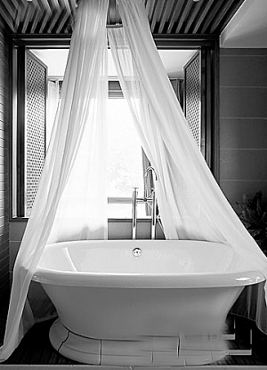 独立式浴缸非常适合在卫生间里营造浪漫的氛围,一个简单的纱帘就让人充满想象。