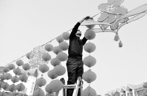 2月24日,南宁市菠萝岭社区居民在悬挂花灯。