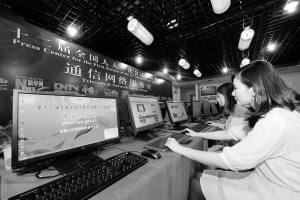 2月26日,媒体记者在新闻中心通讯网络服务室查阅资料。
