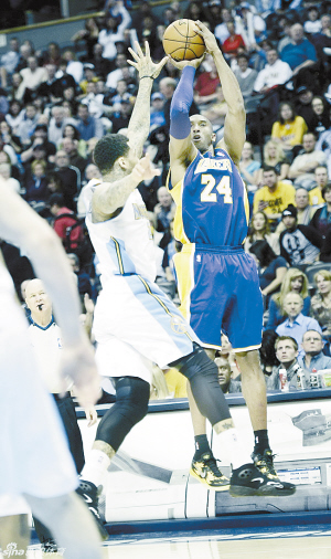 12月对掘金时,科比也曾砍下40分,但湖人失利。昨天是两队本赛季第四次交锋,此前三次交手,掘金2胜1负。