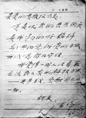 记者看见,在一本被珍藏了半个世纪的《沈阳军区首届共青团员代表会议纪念册》里,这份留言占据了满满一页,上面这样写道: