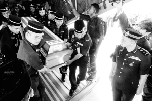 3月4日,在马来西亚沙巴州仙本那,警察护送一名遇难警员的棺木下机。