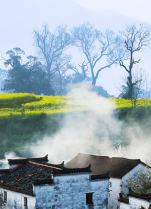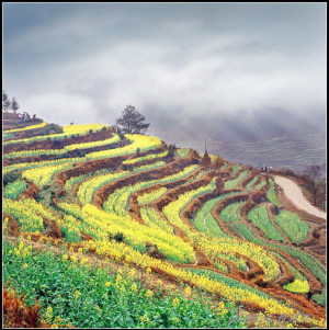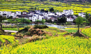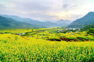 江岭地处婺源最东北部,南临晓起,东接溪头,海拔千米,梯田如链似带,层层叠叠,高低错落;山谷盆地间有小河,河边聚集三四个村庄,四周青山围绕,构成了一幅“天人合一”的农村风光画卷。尤其是身处山顶人家,远眺白墙黛瓦掩在黄花绿树间,阵阵云雾飘来,恍若天上人间。由于地势高,江岭春来也晚,油菜花开要到3月下旬,那时,天气也从乍暖还寒、阴晴不定,变为阳光灿烂,春日融融。层层叠叠的油菜花满山满野地盛开着,黄得纯情、热烈。一早一晚是拍摄油菜花的最佳时段,清晨,油菜花的花瓣上带着露水,阳光下晶莹透亮,无比娇媚;而傍晚的落日余晖,又在满岭的油菜花上笼上了一层淡淡的光晕,微风拂过,清香扑鼻。