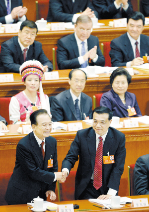 3月5日,第十二届全国人民代表大会第一次会议在北京人民大会堂开幕。这是温家宝作完政府工作报告回到座位后与李克强握手。新华社记者 王颂 摄