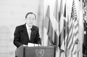 当地时间3月5日,纽约联合国总部,联合国秘书长潘基文在安理会闭门磋商结束后出席记者会。