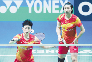 在另一块场地上同时举行的比赛中,中国选手成淑/赵芸蕾以21∶18和21∶7战胜队友马晋/汤金华,帮助中国队提前锁定全英女双的金银牌。