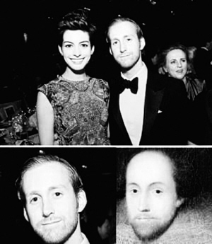 本报综合消息 近日,有眼尖的网友发现,当红女星安妮·海瑟薇的老公相貌神似莎士比亚。这一巧合让网友们连连惊叹,称这简直是“穿越”时空的爱恋。