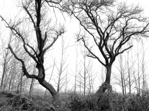 近看,两棵棠梨正好在一片坟头上扎下深根,四周干枯的杂草簇拥着硕大的树干,靠南边的棠梨向东南倾斜,胸围两米有余,靠北边的棠梨向西北倾斜,两棵树的茂密树枝像龙爪一样盘旋着,纠结着。