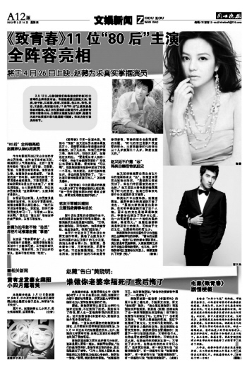 本报综合消息 赵薇导演处女作《致青春》将于4月26日全国公映,近期,赵薇卖力为影片提前吆喝票房,好朋友兼大学同学黄晓明也加入宣传赵薇电影的行列。