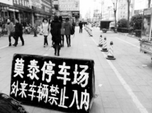 3月16日下午,在周口市区五一路和七一路交叉口向西路南侧的人行道上,来往人群熙熙攘攘,一家莫泰连锁旅馆为了顾客停车方便,把一块写着“莫泰停车场 外地车辆禁止入内”字样的蓝色告示牌摆放在人行道中央,两侧还放置了若干个塑料锥筒以划分停车区域。因为还不是住宿高峰期,停车场停放的车辆还比较少,但不少路过此处的市民纷纷无奈摇头,表示商家擅自把公共场所据为己有,实属不该,管理单位应该赶紧出面管管。