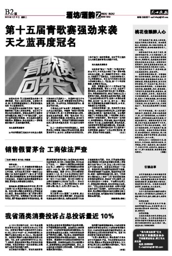 与经典的青歌赛一样,经典的天之蓝也在升级。洋河蓝色经典面市以来,以其首创的绵柔风格和别具一格的蓝色包装,在白酒界掀起了十年的蓝色风暴。十年的辉煌,没有让洋河停下前进的脚步。面对市场的一系列变化,洋河厚积薄发,再度创新,推出升级版蓝色经典·天之蓝,以全新的造型,更优的品质,为消费者带来更舒适的绵柔体验。双剑合璧,经典相连。我们期待蓝色经典·天之蓝杯第十五届青歌赛,能够为广大观众带来更好看、更好听、更高水平的音乐盛宴。(江日)