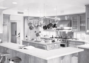 当然这并不是说使用封闭式的厨房设计更好,其实使用复合型厨房设计更佳。复合型厨房功能空间的划分主要包含三个部分:烹饪区、备餐区和就餐区,这些区域有